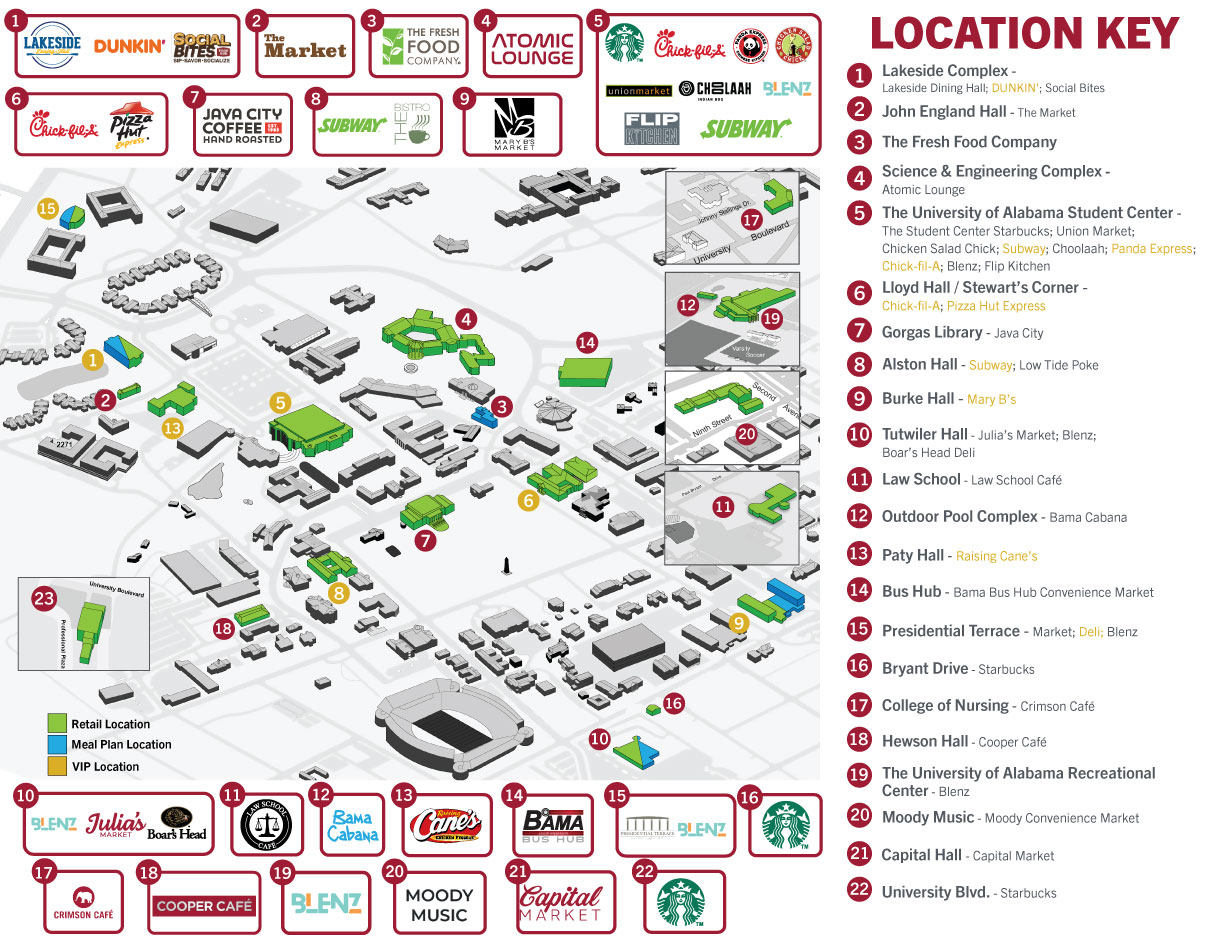 Bama Dining is cashless accepting Dining Dollars, Bama Cash, and debit/credit at all locations.