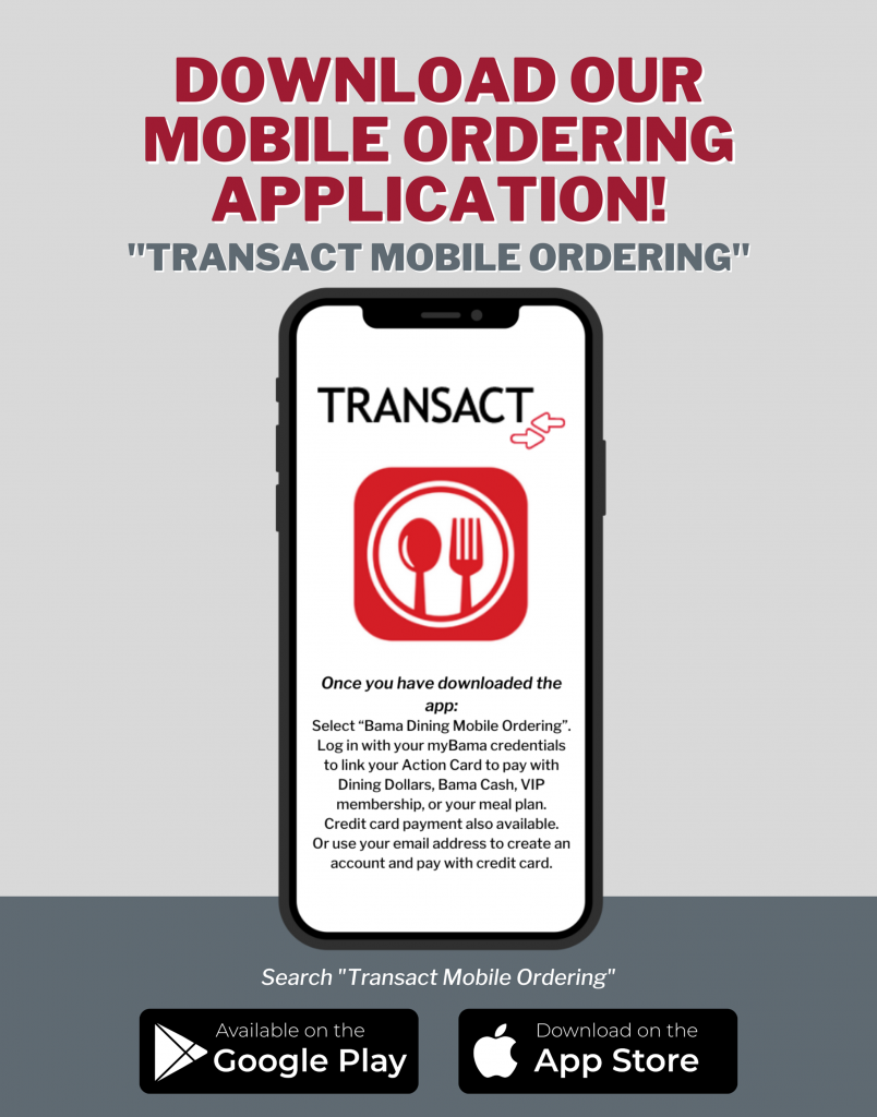 Select “Bama Dining Mobile Ordering”. Log in with your myBama credentials to link your Action Card to pay with Dining Dollars, Bama Cash, VIP membership, or your meal plan. Credit card payment also available or use your email address to creat an account and pay with credit card