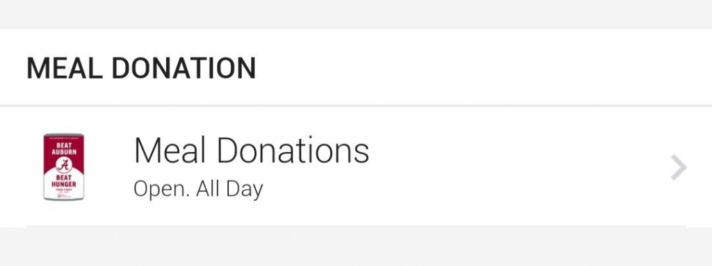 To apply to donate meals, go to the Bama Dining Mobile App and click on the “Meal Donation” location at the top of the page.